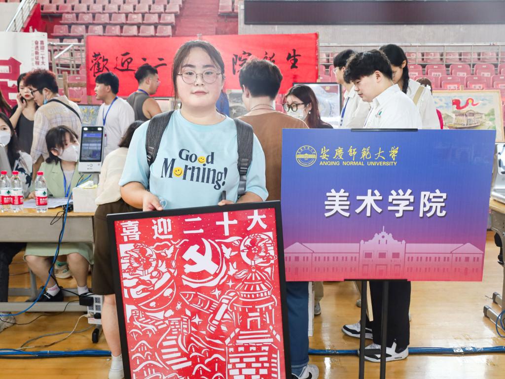 “普天同庆”四个字被印在中国红的灯笼上,中华儿女吹笛擂鼓喜迎二十大,这是美术学专业2022级(2)班的侯晨格格花费了近两周的时间完成的剪纸作品。面对意料之外的“暑假作业”,她另辟蹊径,选择了中华传统文化中的剪纸艺术来完成自己的作业。“剪纸作为中华民族传统艺术,历经千年,仍经久不衰,我想尽自己的绵薄之力让更多人感受到中华优秀传统文化的魅力。”