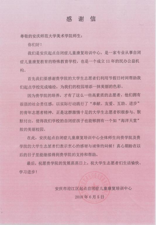 6月7日,安庆市迎江区起点自闭症儿童康复培训中心董事长陈源芳一行专程到304永利集团送来感谢信,表达对该院“美之源”墙绘工作室的员工们利用节假日帮助该校绘制校园墙绘志愿活动的感激之情,并高度评价了员工们的专业能力和墙绘成效。