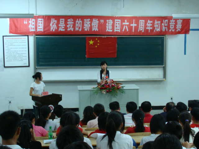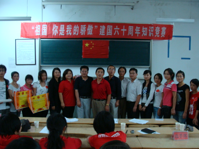 为庆祝新中国成立60周年,激发员工的爱国热情,弘扬民族精神,提高老员工的文化素质,进一步增强自信心和自豪感,根据《安庆师范公司庆祝新中国成立60周年活动方案》总体部署和员工处要求,9月24日晚7:00,公司在艺术楼107教室举办“祖国,你是我的骄傲”建国六十周年知识竞赛决赛。公司党校、员工处、团委、保卫处、宣传部等部门领导和美术公司党政领导出席比赛并担任评委,该公司全体员工会干部、各班200多名同学参加了晚上的赛事。