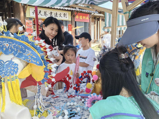 活动现场,非遗创新团队精心设置了多个互动体验区:漆扇体验区内,参与者亲手绘制传统纹样,感受大漆工艺的温润与匠心;扎染体验区则通过折叠、捆扎、浸染等步骤,让市民体验布料与天然染料碰撞出的独特艺术效果;盔帽展示与制作团队现场展示了戏曲“五凤凤冠”“穆桂英凤冠”“将军帽”等手工制作的作品,现场讲解盔帽制作技艺,设计易于大众现场体验的“盔帽发箍”“盔帽吊坠”等材料包,让非遗技艺贴近大众生活,参与者纷纷表示“在动手中学到了传统工艺的精髓”。
