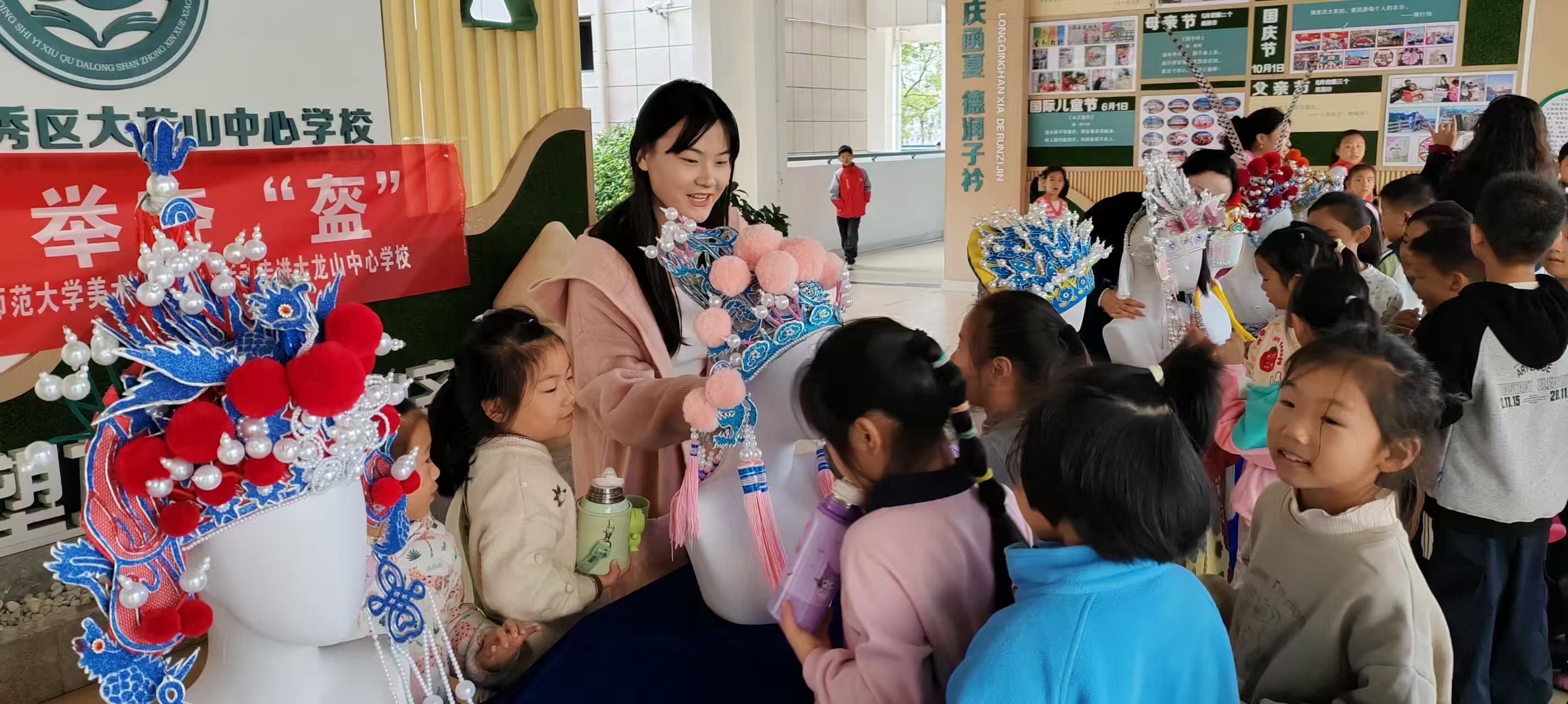 10月22日,304永利集团美术学(师范)专业师生携十余顶精美黄梅戏盔帽教具与分层课程包,走进大龙山中公司,开展“非遗盔帽进校园”主题美育活动。通过文化展示、沉浸式体验与分层教学实践,让传统工艺在青少年心中播下传承的种子,赢得该校师生一致好评。
