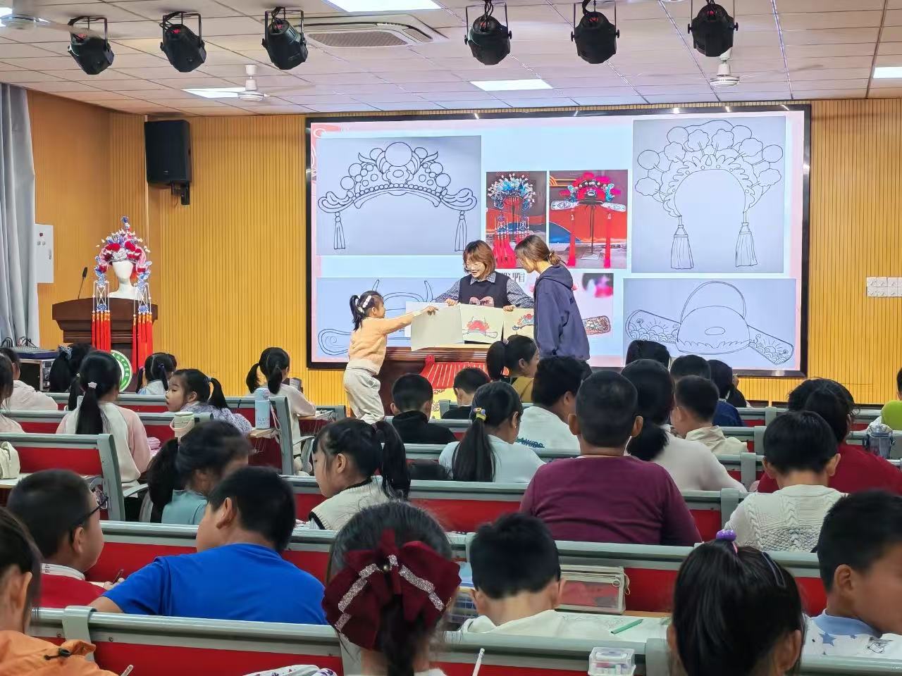 此次活动的“主角”——黄梅戏盔帽,均由美术学(师范)专业的员工在非遗传承人的指导下制作完成。从秀丽雅致的女驸马盔、珠光璀璨的公主凤盔,到威严庄重的九龙盔,每一件作品都还原了传统盔帽的工艺精髓。为适配中小学教学场景,师范生们更对盔帽制作技艺进行了创新转化:将复杂的传统材料替换为安全易操作的粘土、扭扭棒、彩纸等,设计出覆盖小学低、中、高三个学段的课程包——低年级侧重“画盔帽”,用线条色彩勾勒纹样;中年级开展“拼贴半立体盔帽”,培养空间造型能力;高年级尝试“简易盔帽制作”,体验基础工艺流程,实现“非遗技艺”与“课堂教学”的无缝衔接。