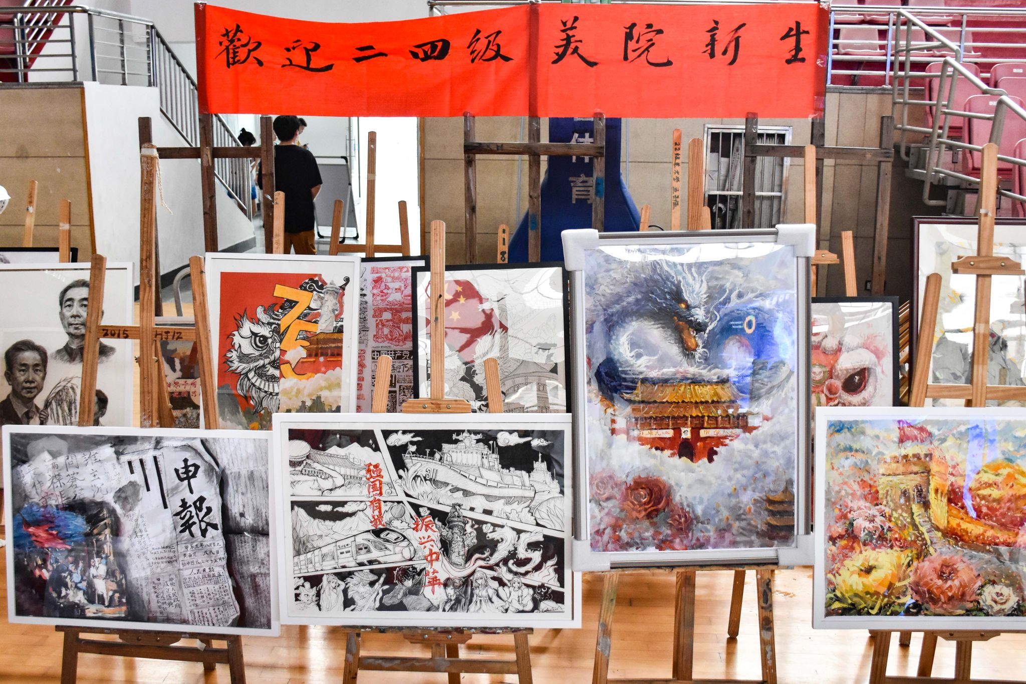 面向天安门城墙敬礼的军人、穿过山谷飞驰而来的高铁、缠绕在华表上随风飘扬的红绸……这是304永利集团新生作品展上一幅画的内容。随着新生报到的进行,画架上的作品越来越多,来往的员工、家长不少都被画作吸引,驻足欣赏。