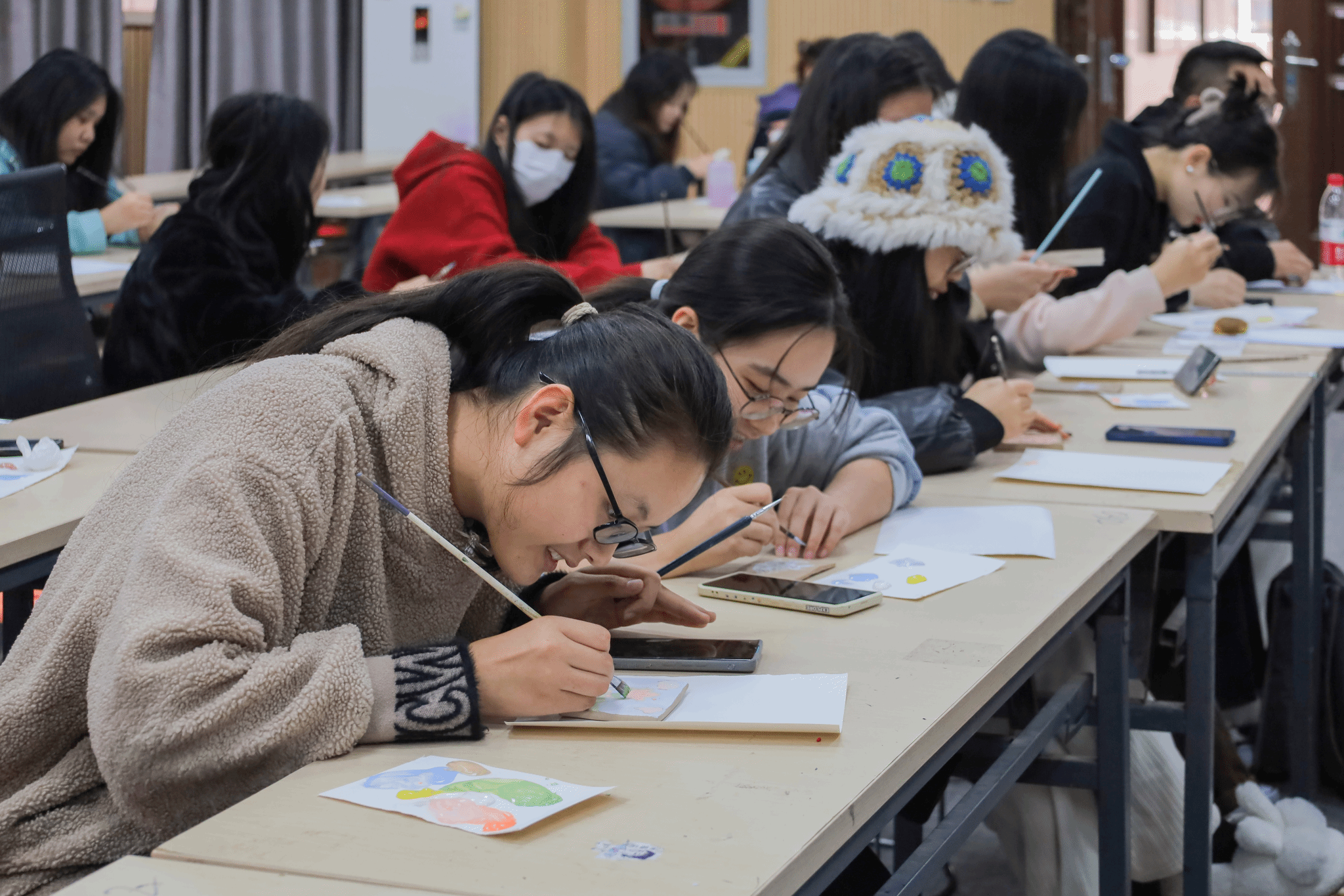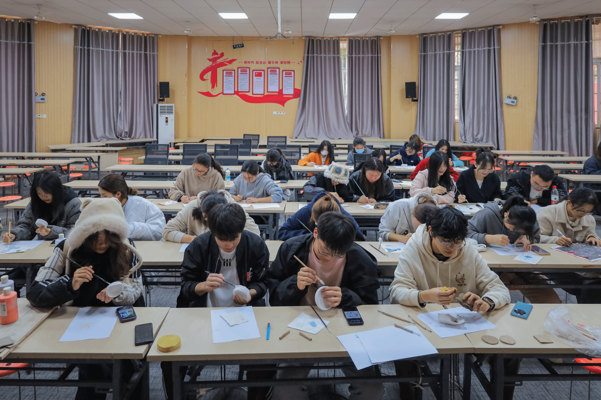 以陶土原色为底,细笔蘸上双色釉料勾勒花纹,不到一小时,一片结合了巴洛克风格花纹与青花瓷的陶片便“诞生”于设计学类专业2023(3)班的邰甜甜手中。“这是我首次在陶土上绘制图案,感觉十分新奇。”邰甜甜表示,作为一名陶艺爱好者,此次活动让她体验感满满,在绘制图案的过程中放松了身心。