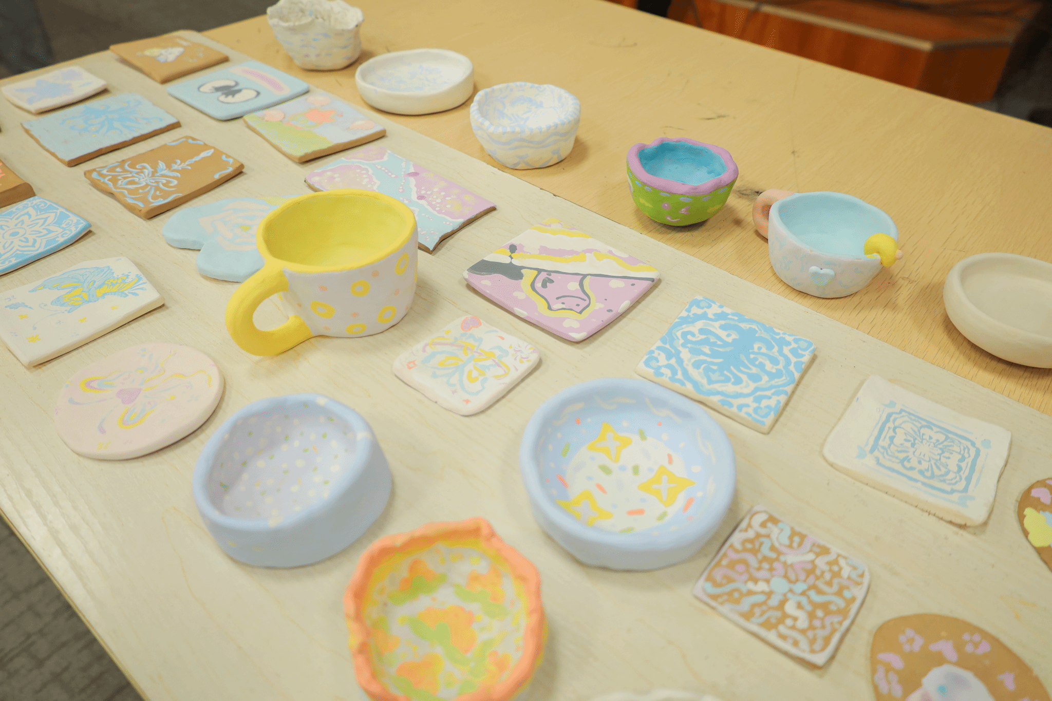 为了给广大学子带来“沉浸式”活动体验,院陶艺俱乐部负责人、美术学专业2022(5)班的汤羽洁早在一周前便携手俱乐部成员捏制陶片、陶碗等工艺制品的雏形,待活动参与者用釉料上色。陶土半成品、海绵及各色釉料准备完毕,一场“陶土盛宴”即将拉开序幕。