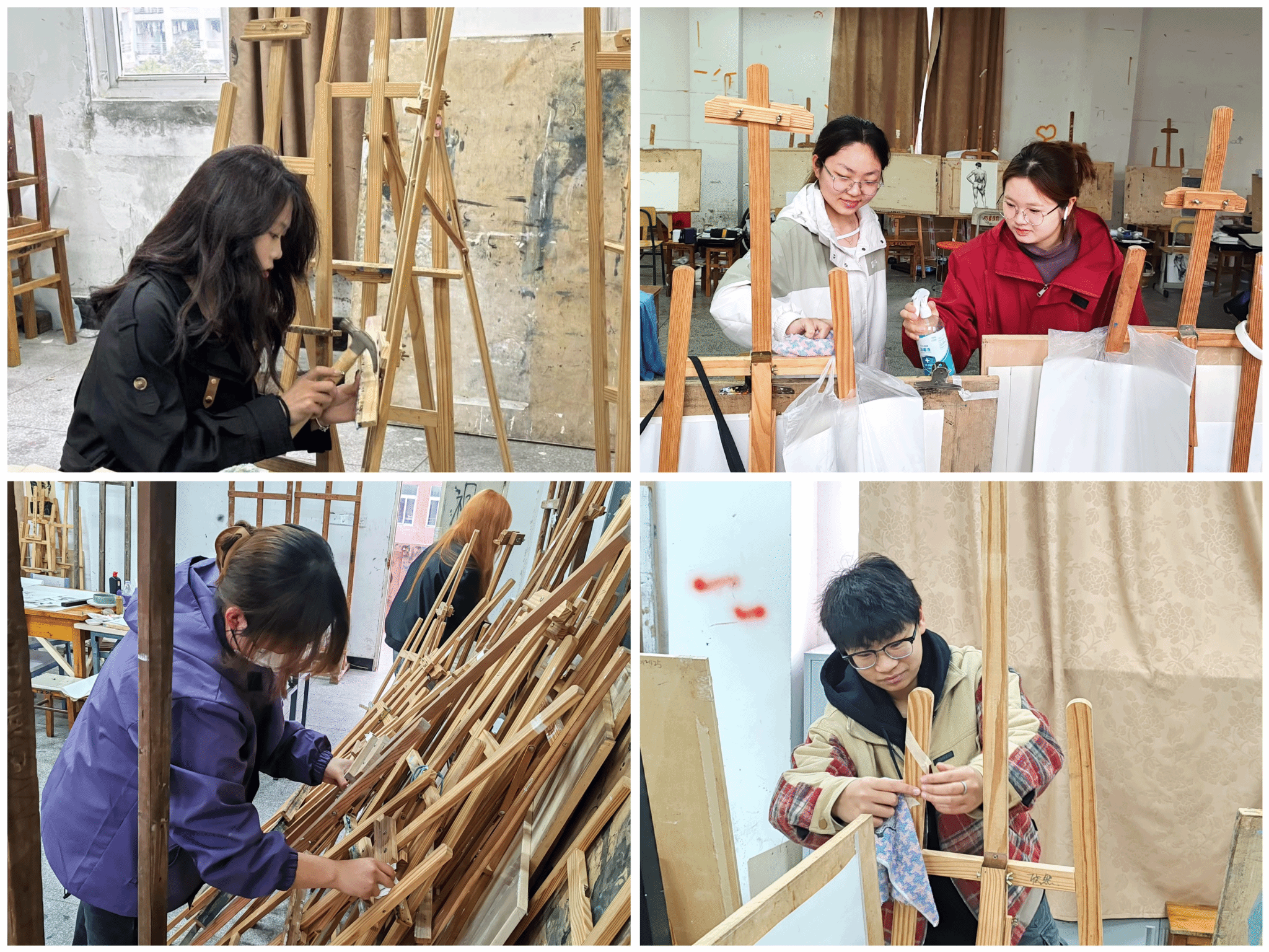画架支架是否结实稳固?画架表面是否磨损?志愿者们奔走多个教室,对画架进行逐一排查。美术学专业2023(1)班的王婧感叹,看似简单的工作实施起来却很复杂,如遇到结构严重损坏的画架,需要运用专业工具进行修复,出现故障的画架则需要细致拆解重组。