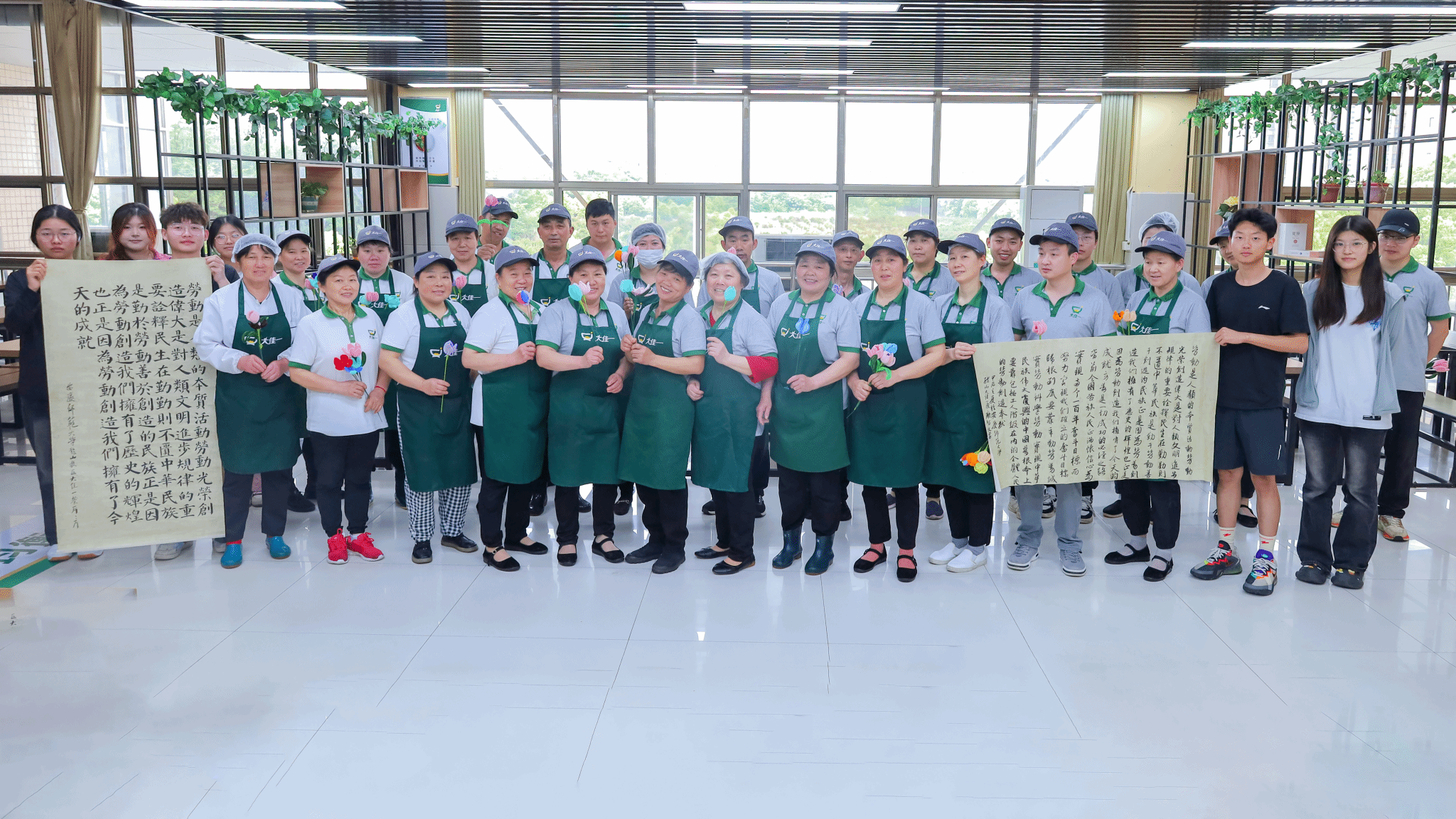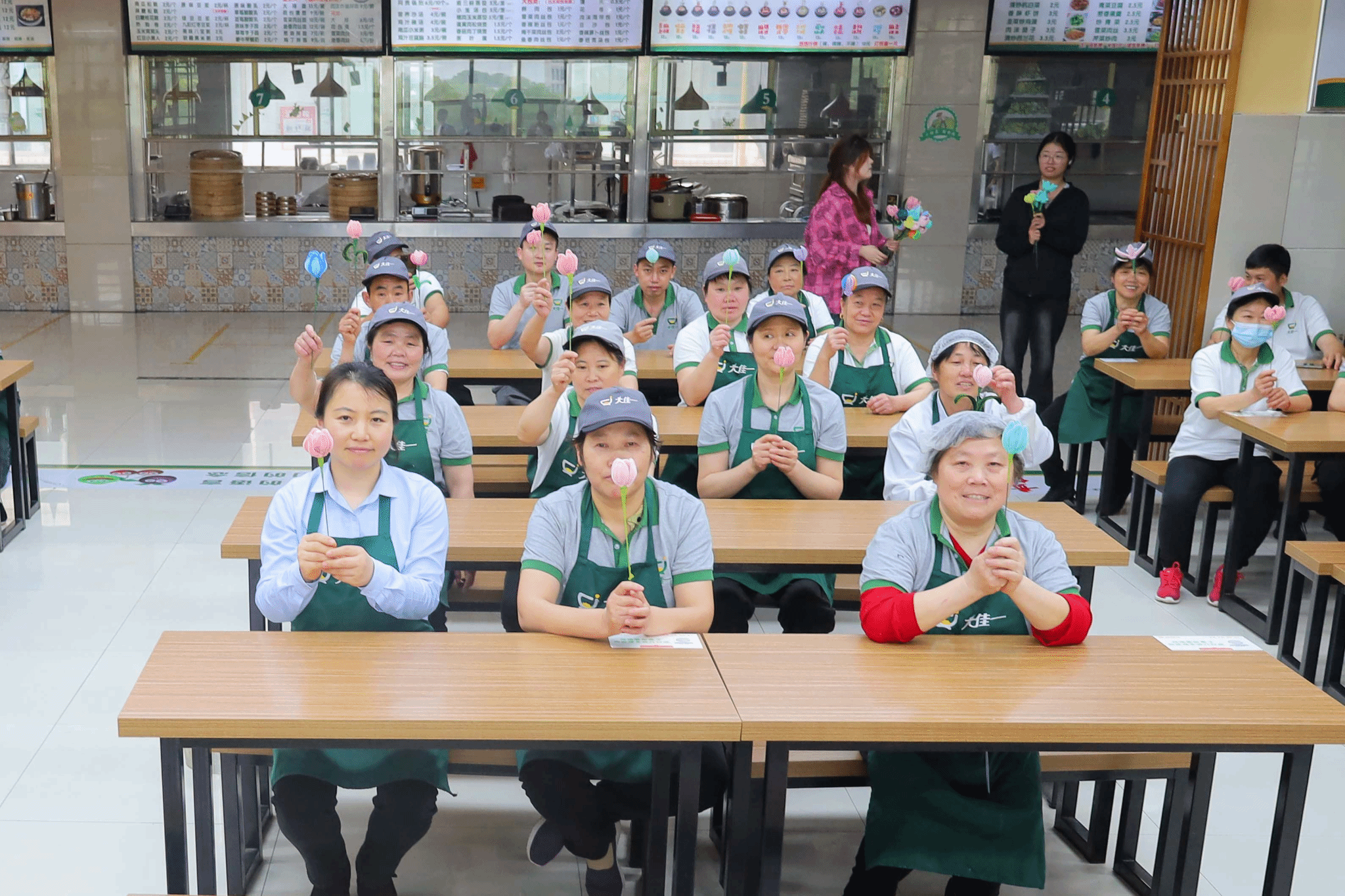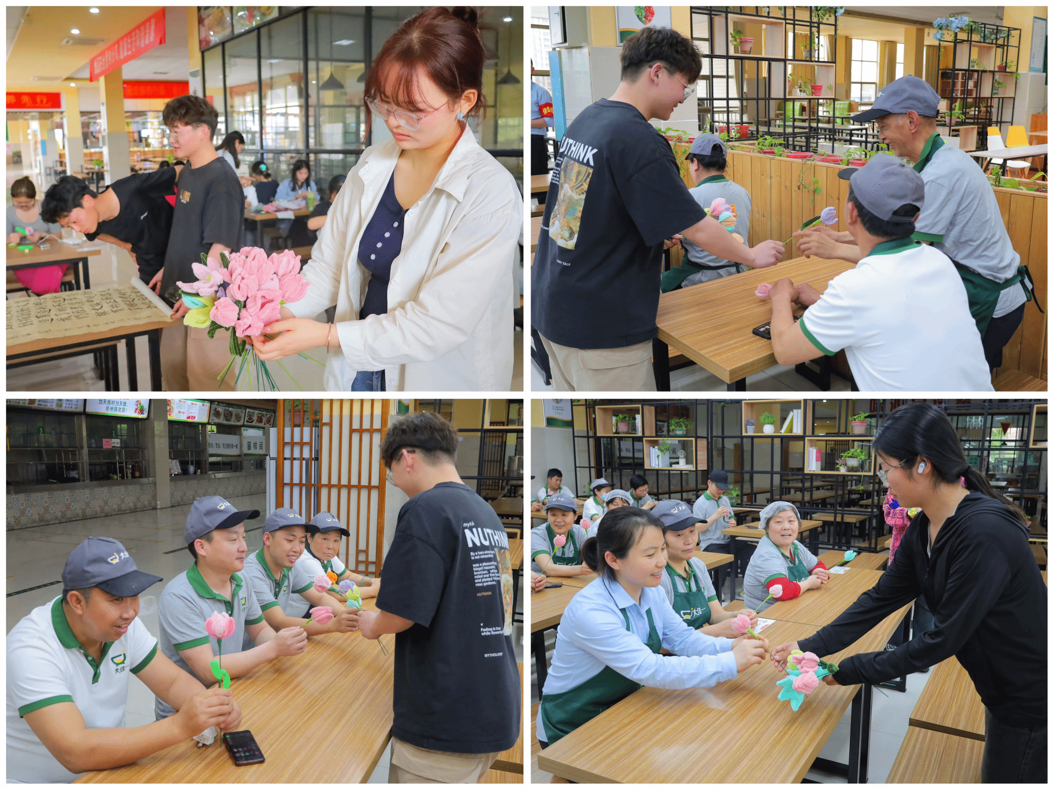 在清点好扭扭棒花卉的数量后,员工们分组将花朵赠送给食堂正在劳作的工作人员,并向他们表达了真挚的谢意。“收到手工制作的花,我打心底感到感动,同学们真的十分用心。”食堂工作人员在收到花束以后,纷纷对手工花朵的精细度表示赞叹。