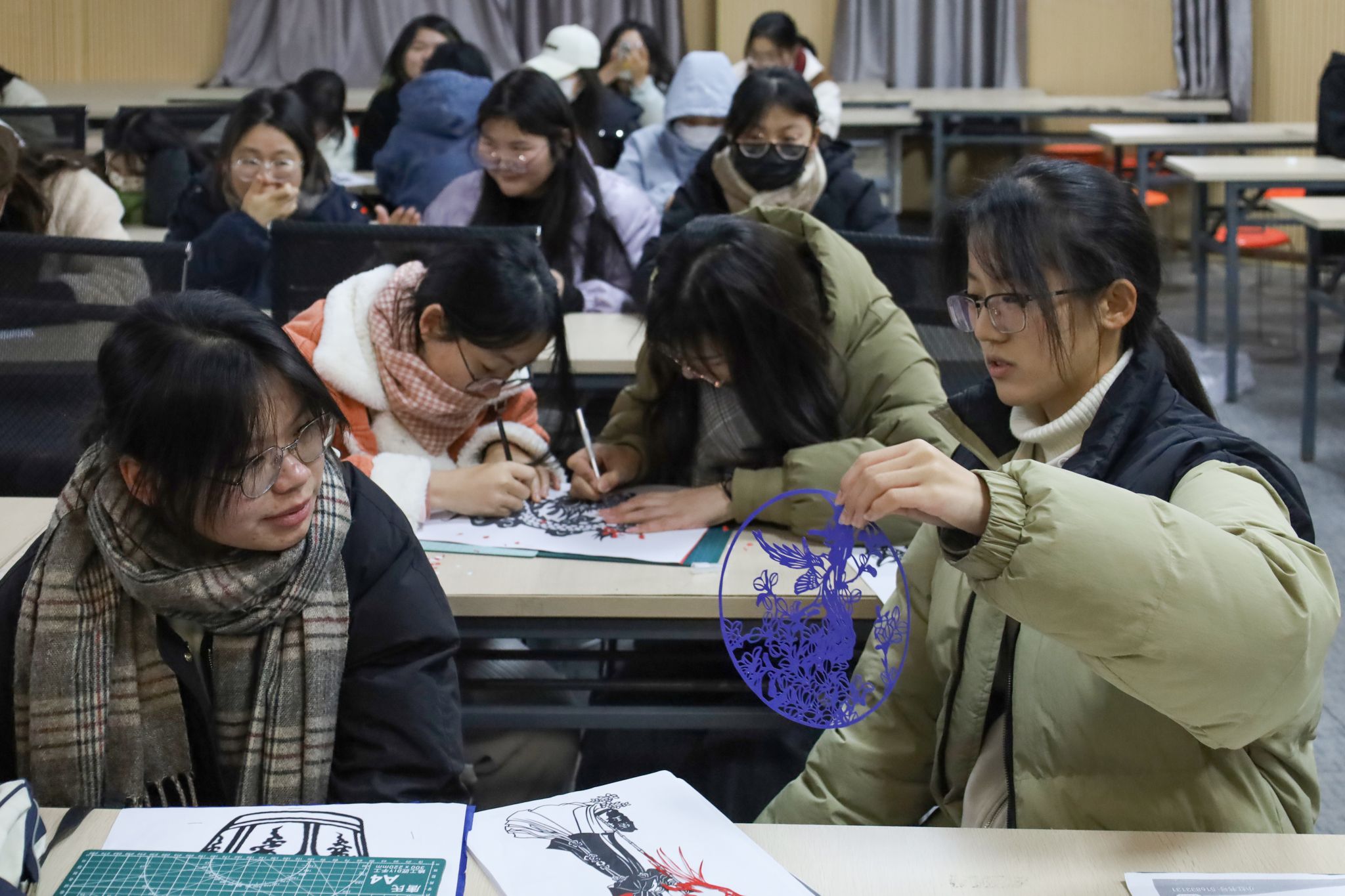 一份垫板、一张热转印纸、一份底稿、一把刻刀,这是刻印一张主题剪纸的全部材料。304永利集团剪纸俱乐部负责人、美术学专业2021(2)班的陶悦表示,由于热转印纸相比于普通红纸硬度更高,此次刻印对于“剪纸老手”来说都是不小的挑战。